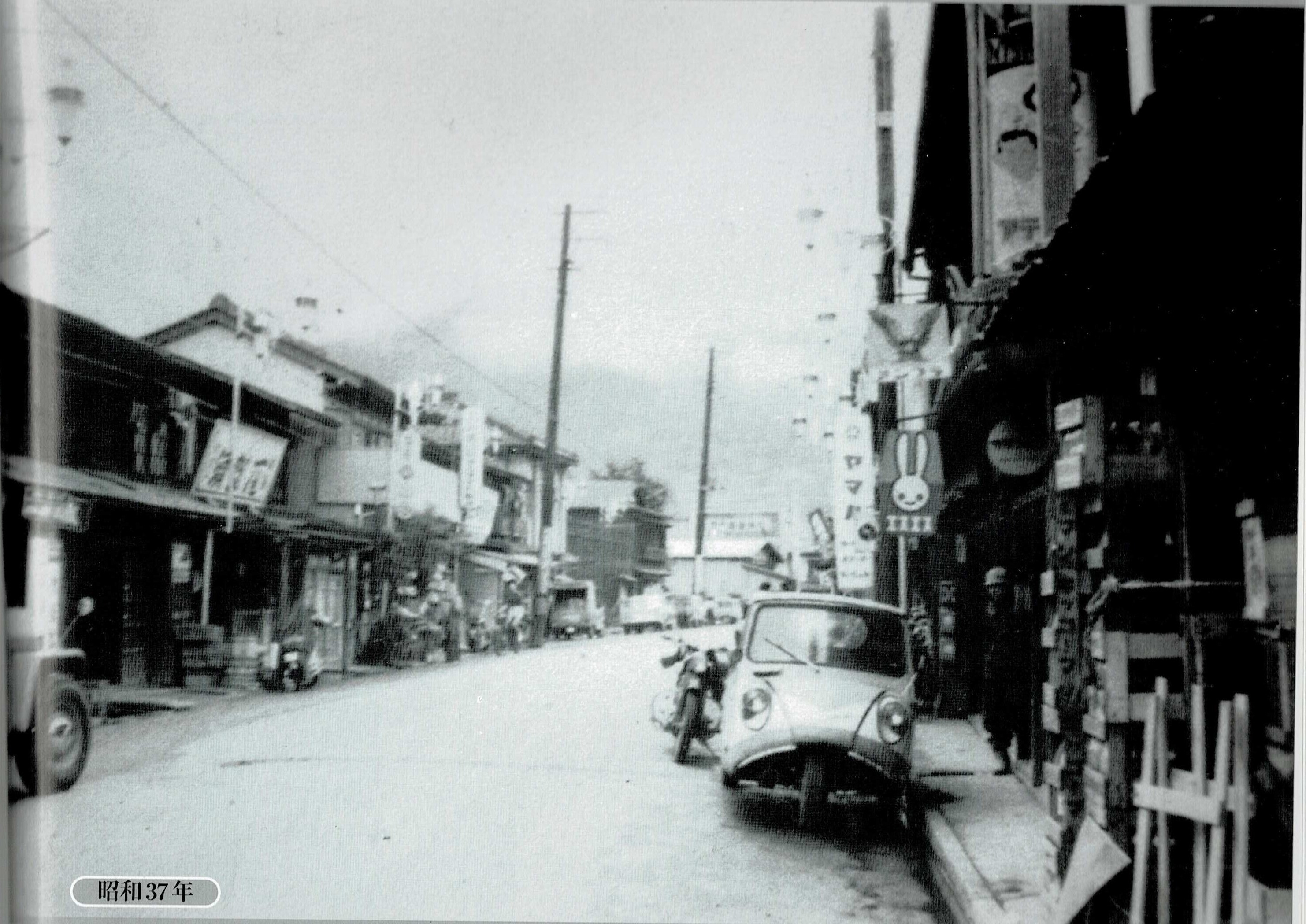 | 昭和37年の仲町界隈。 右側オート三輪が停まっているのは仁科自転車店 |